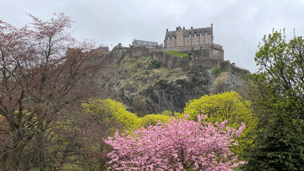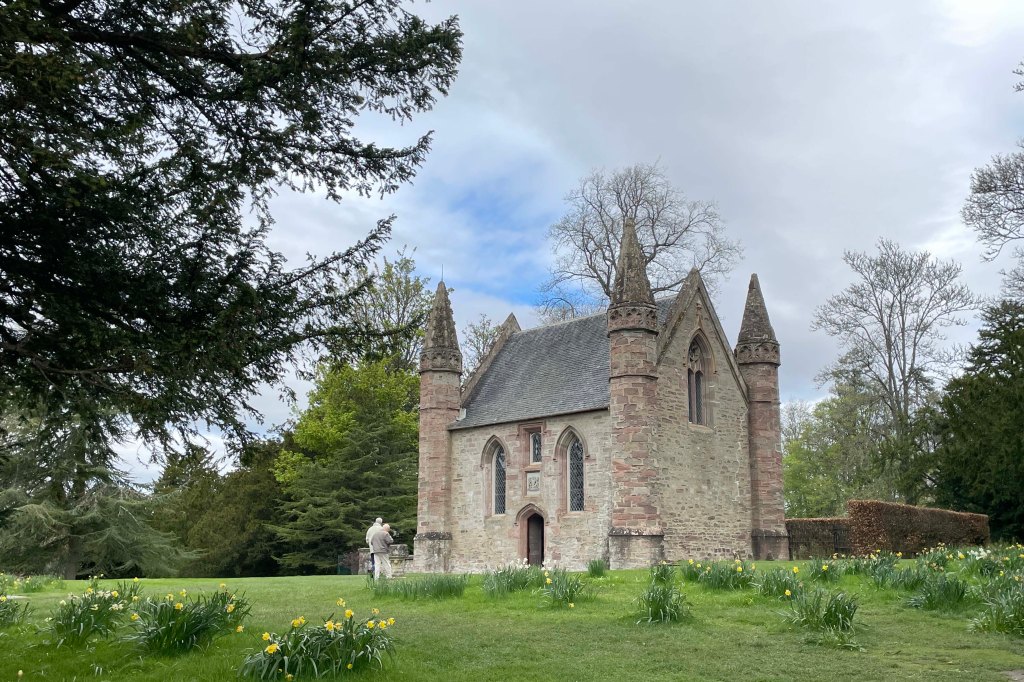 With the strident calls of residential peacocks resounding in the air we negotiated the sweeping lawns and entered the Palace. Unfortunately, no photos were allowed, but we marveled at the sumptuous, beautifully preserved furnishings in what is still, after 400 years the home of the Earls of Mansfield. It was what we all imagined a palace should look like. The tiny, 17th century chapel sits nearby on Moot hill where daffodils decorated the lawns with their yellow heads and where a replica of the Stone of Scone sits.