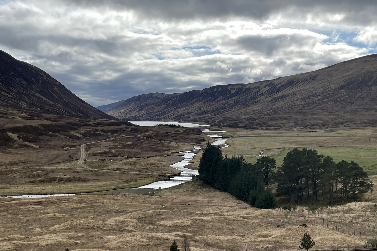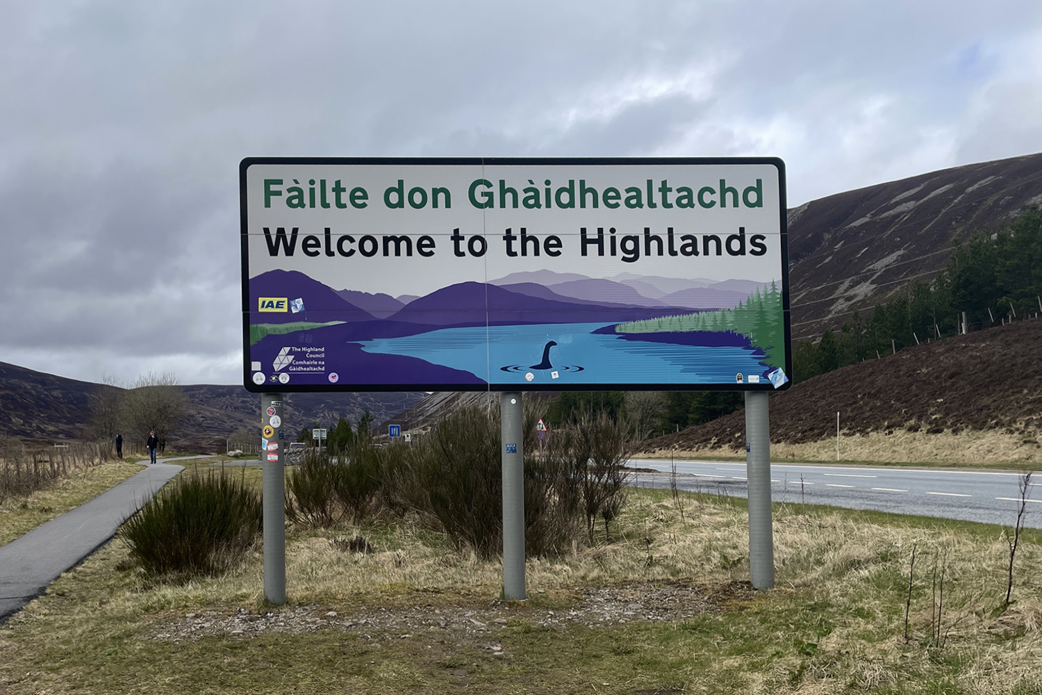 As the mountains closed in around us, we felt we’d actually reached the Scottish Highlands. This was confirmed when we passed a sign on the side of the road, so of course we had to stop – recording our first steps in the Scottish Highlands was extremely important!