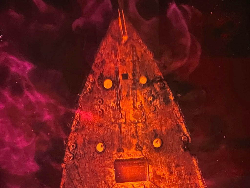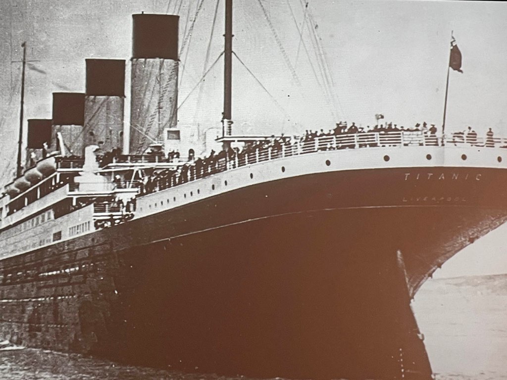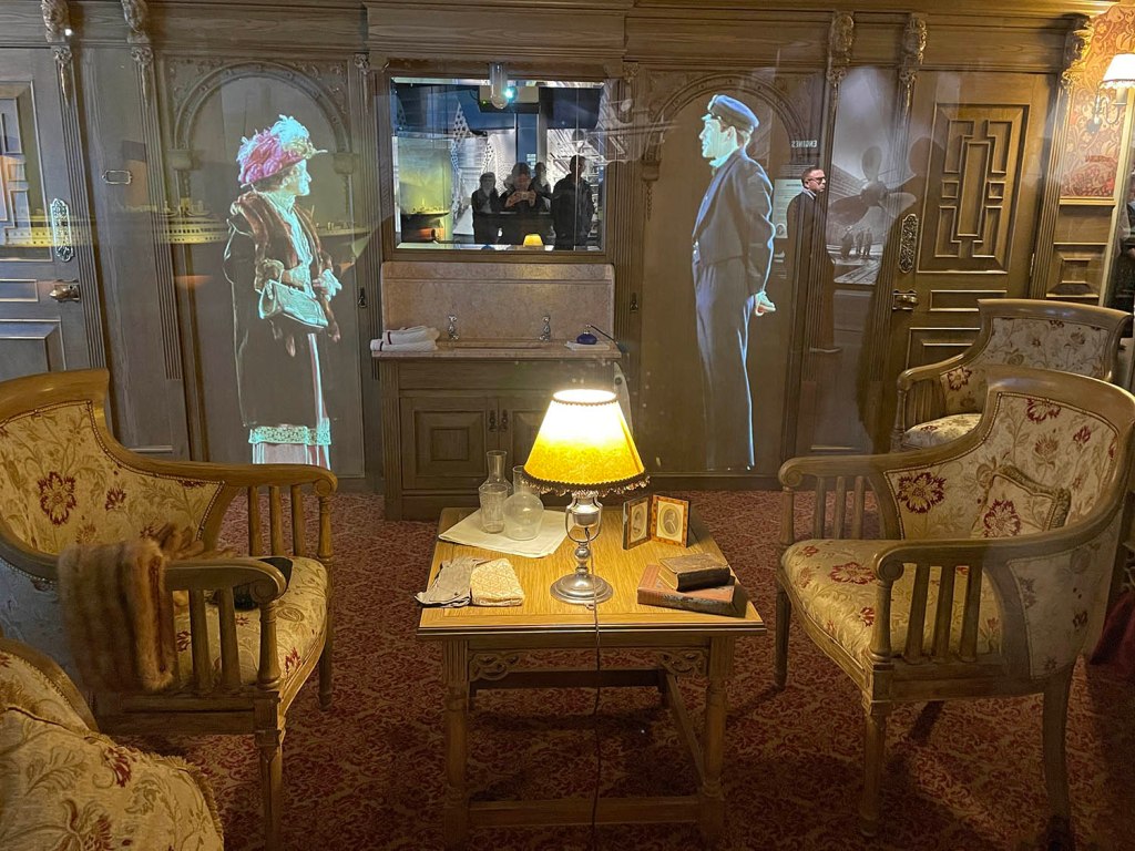 On the 14th April the Titanic hit an iceberg, and on the 15th April, in the early hours of the morning the Titanic sank. The final messages pleading for help by the desperate crew are displayed on boards.