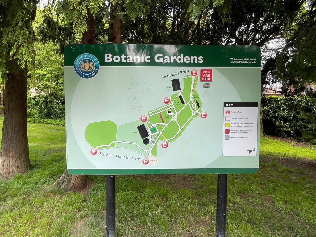 Day 2 started with fine weather which uplifted my spirits somewhat. Although Day 1 was interesting and I was able to delve into the recent history of Belfast, I found it was sad, even depressing. I needed to go somewhere and see something which reduced that feeling and where better than to experience nature at the Belfast Botanic Gardens.