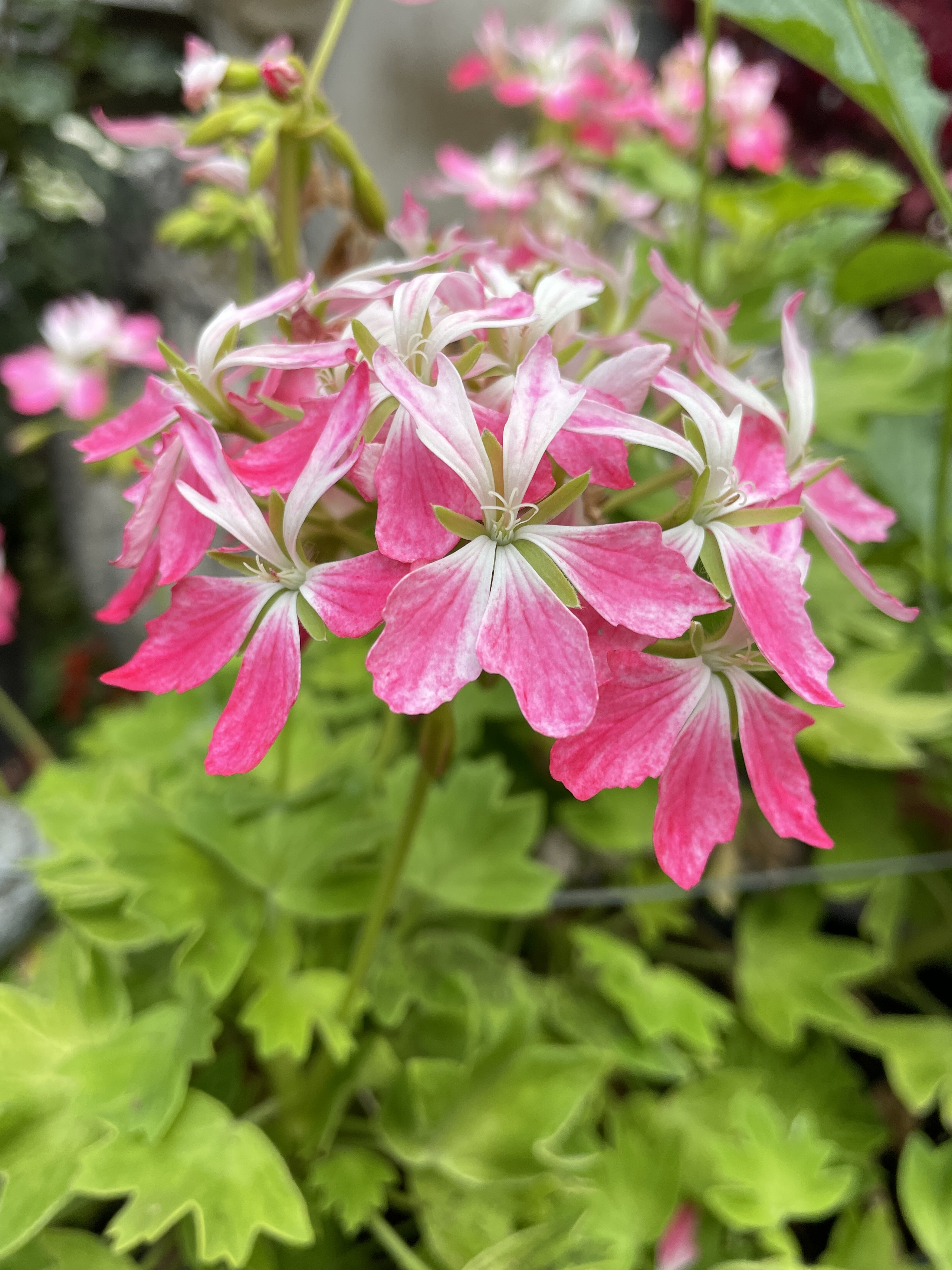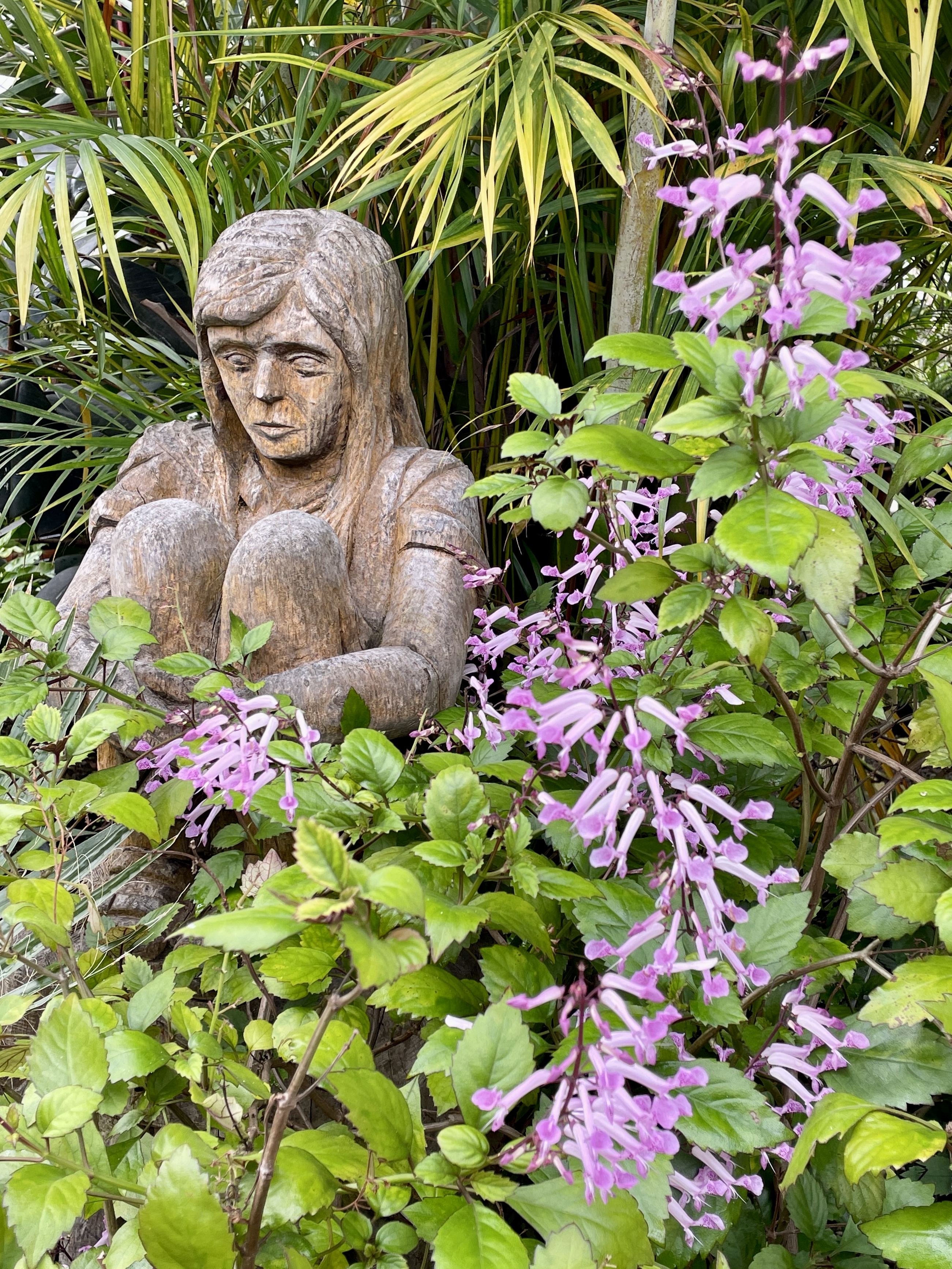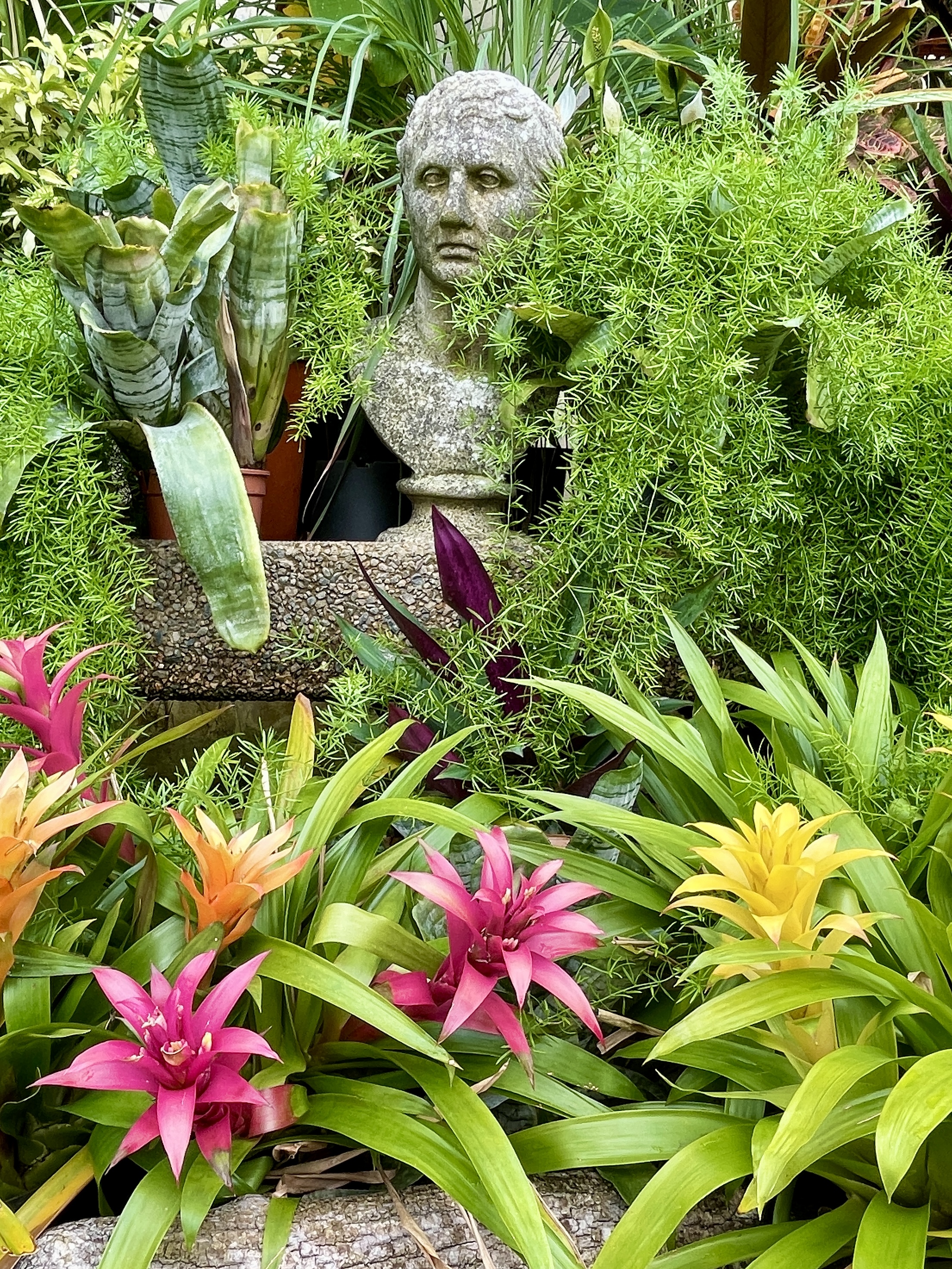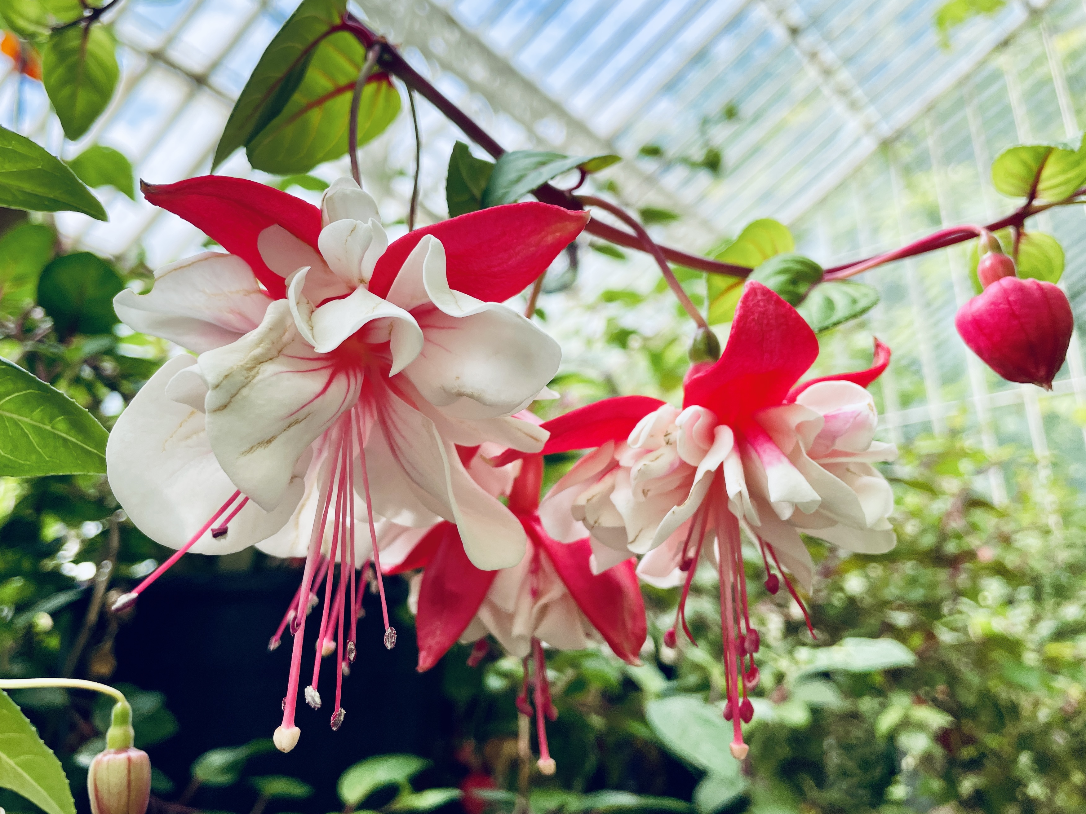 The cool wing was filled with a mass of fuscias, geraniums, and begonias. The hot wing had a range of exotic plants such as bromeliads and coleus. The centre dome contained tall trees, climbers and colourful hanging baskets. It was a heady mix, a sight to fill the heart of the most avid gardener!