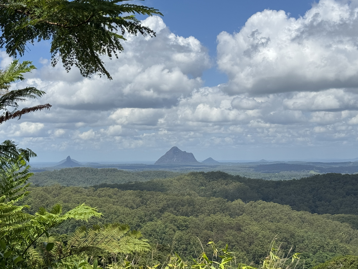 A very late lunch at the cafe in the Mary Cairncross Discovery Centre was accompanied by glorious views of the Glasshouse Mountains and a leech which had escaped the nearby rainforest walk to terrorise patrons.