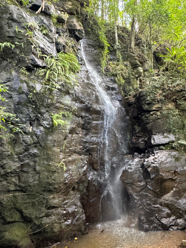 We continued our downhill walk holding tightly onto the rail to stop sliding into in a tangled heap at the bottom. On the way we were passed by a very sensible family – they’d hired a golf buggy! I gazed enviously at their backs as they waved and went on. Eventually we reached the bottom and continued our search for the waterfall which was pinpointed on the map.